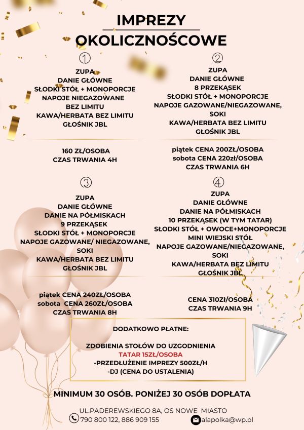 Jesteśmy otwarci na Twoje pomysły i sugestie! Chcemy, aby Twoje przyjęcie było tak wyjątkowe, jak Ty sam/a. Dlatego też jesteśmy gotowi dostosować nasze usługi do Twoich osobistych preferencji i potrzeb, aby spełnić wszystkie Twoje oczekiwania.